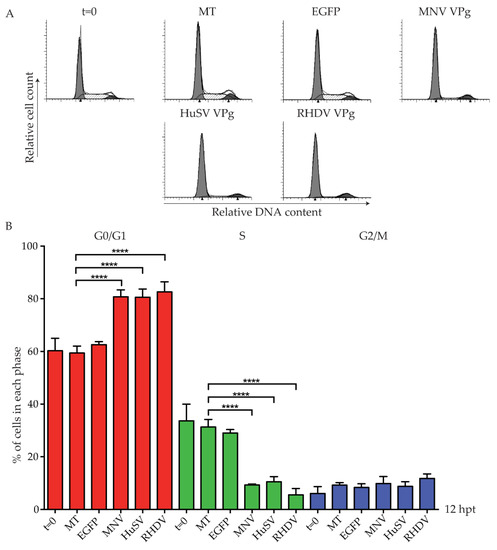 Human sapovirus (HuSV) VPg and rabbit hemorrhagic disease virus (RHDV) VPg induce a G0/G1 phase cell cycle arrest. RAW-Blue cells were transfected with 4–5 µg of in vitro transcript RNA corresponding to EGFP, MNV VPg, HuSV VPg, RHDV VPg, feline calicivirus (FCV) VPg, or Newbury1 VPg. Mock transfected (MT) cells were seeded at the time of transfection as a negative control. At 12 hpt, cells were harvested for FACS analysis of the cell cycle. (A) Representative FACS histograms from one of three experiments. (B) The histograms were analysed using MODfit LT 3.0, and the percentage of cells in each phase of the cell cycle are shown. The results present the mean and SD from three independent experiments. Statistical significance was determined for comparisons between transfected cells and mock transfected cells using a one-way ANOVA with Dunnett’s post-test. **** p ≤ 0.0001.