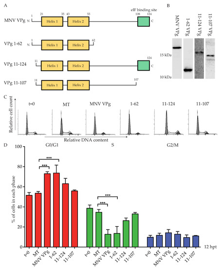 Expression of VPg 1–62 induces a G0/G1 phase cell cycle arrest. RAW-Blue cells were transfected with 4–5 µg of in vitro transcript RNA corresponding to MNV VPg, VPg 1–62, VPg 11–124, or VPg 11–107. Mock transfected (MT) cells were seeded at the time of transfection as a negative control. At 12 hpt, cells were harvested for western blot and FACS analysis of the cell cycle. (A) Schematic of full-length MNV VPg and synthetic constructs. Numbers indicate the amino acid position within key structural elements. (B) Representative western blot of full length MNV VPg and VPg truncations. Histograms (C) from FACS analysis were analysed on MODfit LT 3.0, and the percentage of cells in each phase of the cell cycle graphed (D). The results present the mean and SD from three independent experiments. Statistical significance was determined for comparisons between transfected cells and mock transfected cells using a one-way ANOVA with Dunnett’s post-test. *** p ≤ 0.001.