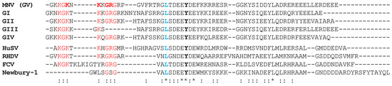 - Leen, E.N.; Kwok, K.Y.; Birtley, J.R.; Simpson, P.J.; Subba-Reddy, C.V.; Chaudhry, Y.; Sosnovtsev, S.V.; Green, K.Y.; Prater, S.N.; Tong, M.; et al. Structures of the compact helical core domains of feline calicivirus and murine norovirus VPg proteins. J. Virol. 2013, 87, 5318–5330. [Google Scholar] [CrossRef] [PubMed]