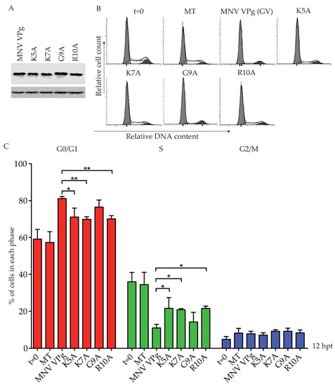 Mutation of positively charged amino acids within the N-terminal region of MNV VPg reduces the G0/G1 cell cycle arrest. RAW-Blue cells were transfected with 4–5 µg of in vitro transcript RNA, corresponding to MNV VPg or single-point mutant versions K5A, K7A, G9A, or R10A. Mock transfected (MT) cells were seeded at the time of transfection as a negative control. At 12 hpt, cells were harvested for western blot and FACS analysis of the cell cycle. (A) Expression of MNV VPg and point mutants was determined by western blot with actin as a loading control. (B) Representative FACS histograms from one of three experiments. (C) The histograms were analysed using MODfit LT 3.0, and the percentage of cells in each phase of the cell cycle are shown. The results present the mean and SD from three independent experiments. Statistical significance was determined for comparisons between mutanted VPg transfections and MNV VPg transfected cells using a one-way ANOVA with Dunnett’s post-test. * p ≤ 0.05 and ** p ≤ 0.01.