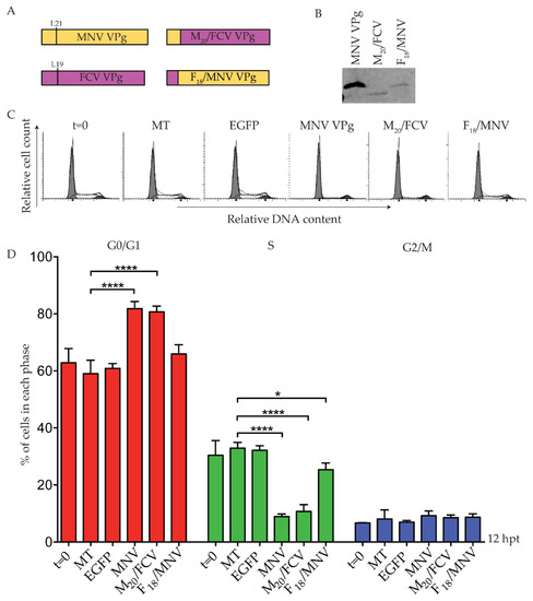 A chimeric protein M20/FCV VPg induces a G0/G1 arrest. RAW-Blue cells were transfected with 4–5 µg of in vitro transcript RNA corresponding to EGFP, MNV VPg, or chimeric VPg constructs. Mock transfected (MT) cells were seeded at the time of transfection as a negative control. At 12 hpt, cells were harvested for western blot and FACS analysis of the cell cycle. (A) Schematic for the design of chimeric VPg constructs. Chimeric constructs were designed around a conserved leucine reside of MNV VPg and FCV VPg to exchange the N-terminal region. (B) Expression of MNV VPg and chimeric VPg proteins was determined by purification of Strep-tag II protein on beads followed by western blot. (C) Representative FACS histograms from one of three experiments. (D) The histograms were analysed using MODfit LT 3.0, and the percentage of cells in each phase of the cell cycle are shown. The results present the mean and SD from three independent experiments. Statistical significance was determined for comparisons between transfected cells and mock transfected cells using a one-way ANOVA with Dunnett’s post-test. * p ≤ 0.05 and **** p ≤ 0.0001.