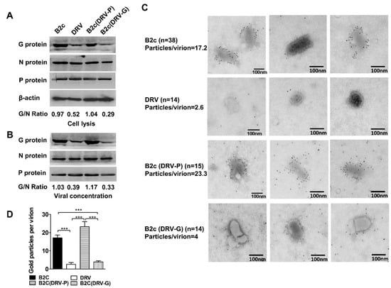 Our recent studies demonstrated that wt RABV evades DC-mediated immune activation by expressing low levels of G in infected cells, which results in inefficient binding/entry into DCs []. To determine if G expression in infected cells affects G incorporation into virions, NA cells were infected with a laboratory-attenuated RABV (B2c), a wt RABV (DRV), a recombinant B2c expressing DRV G [B2c (DRV-G)], or a recombinant B2c expressing DRV-P [B2c (DRV-P)] at MOI of 1. To exclude the possibility that differences in the level of G expression are due to differences in the binding affinity of the detecting antibodies, an in vitro translation system was employed to synthesize G from CVS-B2c and DRV as described previously []. To examine the binding affinity of antibodies to G, the synthesized proteins were immunoprecipitated with G53 and then detected by western blot using streptavidin-HRP. As shown in Figure S1, similar amounts of B2c G and DRV-G were detected (IOD 166 vs. 177). As shown in Figure 1A, a significantly higher level of G was detected in cells infected with CVS-B2c or B2c (DRV-P) than in those infected with DRV or B2c (DRV-G). By contrast, the levels of N and P proteins were similar in cells infected with each of the viruses. The ratio of band signals corresponding to the G and N immune-reactive proteins (G/N ratio) was higher in cells infected with B2c (0.97) or B2c (DRV-P) (1.04) than that in cells infected with DRV (0.59) or B2c (DRV-G) (0.20) (Figure 1A). These data confirm that wt RABV selectively restricts expression of G [,,,,].