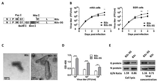 In contrast to wt RABVs, most attenuated RABVs express high levels of G and induce strong adaptive immune responses that protect the host from rabies infection. To examine whether overexpression of G further enhances G incorporation into virions, a recombinant RABV, B2c-3G, which contains three copies of G, was constructed from the B2c full-length plasmid [] (Figure 2A). To ensure triple expression of G, each copy of G has its own open reading frame as described previously [,]. The replication rates of the parental B2c and B2c-3G were determined in NA and BSR cells by single-step growth kinetics. As shown in Figure 2B, the replication rate of B2c was similar to that of B2c-3G during the first two days in both NA and BSR cells. By 3 dpi (BSR cells) or 4 dpi (NA cells), the viral titer of B2c-3G was significantly higher than that of B2c.