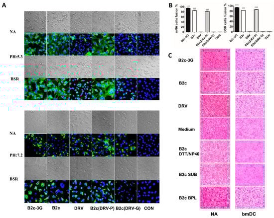 Previous studies found that RABV enters the cell through the endocytic pathway, and the viral envelope fuses with the endosomal membrane after acidification []. Because G is the unique outer component of RABV, a low pH-dependent cell fusion assay was performed as described previously [] to determine whether the level of G expression and/or incorporation affects cell-to-cell fusion. This assay simulates virus-induced endosomal membrane fusion, which is the uncoating step of the RABV replication cycle []. As shown in Figure 4A, BSR and NA were infected with 1 MOI of B2c, B2c-3G, DRV, B2c (DRV-P), or B2c (DRV-G) and the N protein of RABV was stained with FITC-labeled antibody. At 2 dpi, all infected cells showed similar levels of N protein expression at pH 7.2. However, when the pH of media was changed to 5.3, more than 80% of cells infected with B2c or B2c (DRV-P) showed cell membrane fusion. As in uninfected cells, no cell fusion was observed in cells infected with DRV or B2c (DRV-G). B2c-3G induced the strongest cell membrane fusion among all of the viruses (Figure 4B). To further confirm that the level of G incorporation affects viral uncoating by influencing cell membrane fusion, the same gene copies number (1012 copies/mL) of sucrose gradient-purified RABVs were incubated with BSR cells for 4 h and then treated with fusion media (pH 5.3) for 0.5 h. As shown in Figure 4C, B2c-3G induced the strongest cell fusion among all the viruses, whereas DRV did not induce any cell fusion. Cell fusion was inhibited when B2c-3G and B2c were treated with DTT/NP40 or SUB. However, BPL treatment did not affect viral induction of cellular membrane fusion. Thus, removal of G from virions restricted G-dependent cell membrane fusion, providing evidence that wt RABV does not efficiently infect DCs due to its restriction of G-induced cell membrane fusion.
