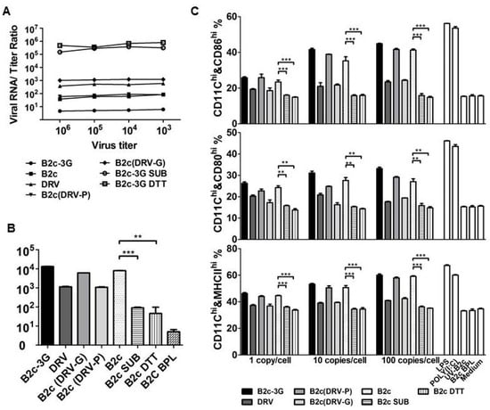 To further examine DC activation induced by RABVs with different levels of G incorporation, expression levels of CD80, CD86, and MHCII were determined using flow cytometry. DCs were incubated with 1, 10, and 100 gene copies/cell. As shown in Figure 5C, the levels of CD86, CD80, and MHCII expression increased in a gene copy number-dependent manner in DCs infected with CVS-B2c, B2c (DRV-P), or B2c-3G but not in DCs infected with DRV, B2c (DRV-G), or RABVs treated with SUB or DTT/NP40. Furthermore, RABVs entirely lost the ability to activate DCs when the viral genomic RNA was inactivated by UV or BPL. The levels of these costimulatory molecules on DCs infected with DRV, B2c (DRV-G), or RABV treated with SUB or DTT/NP40 did not change after increasing virus doses, demonstrating that the inability of wt RABVs or G-deficient RABVs to activate DCs is not dependent on the infection dose.