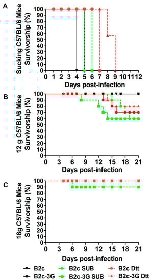 To determine if the level of G incorporation mediates peripheral RABV immune evasion, C57BL/6 mice were infected intramuscularly (IM) with RABV at 106 gene copies/mouse and observed daily for clinical signs for 21 days (Figure 6B,C). All adult mice inoculated with B2c-3G, B2c, or treatment buffer only (containing 10 mM DTT/0.05% NP40 or 100 µg/mL SUB) through IM injection did not develop disease regardless of mouse age and weight. However, for mice with body weights of 12 to 14 g, the mortality rates of mice infected with DTT/NP40- or SUB-treated B2c or B2c-3G ranged from 20% to 40% (Figure 6B). For mice with body weights of 18 to 20 g, only one mouse infected with SUB-treated B2c-3G developed clinical signs of rabies (Figure 6C). These results indicated that G-deficient RABVs had significantly increased pathogenicity and presented a higher risk for young mice than for adult mice.