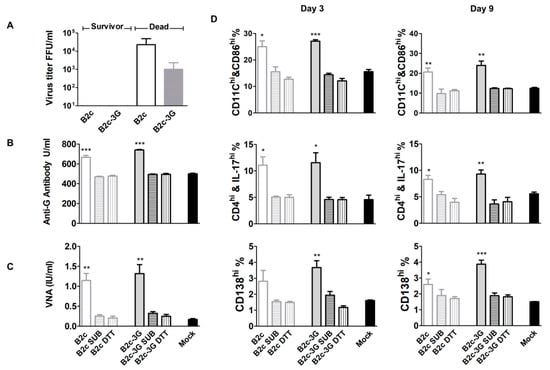 To examine whether decreased G incorporation further reduces immunogenicity, suckling mice were infected with RABVs before or after treatment with SUB or DTT/NP40. In mice that succumbed to rabies, the average viral titer reached 104.3 FFU/mL in B2c-infected mice and 103 FFU/mL in B2c-3G-infected mice (Figure 7A). In mice infected with B2c-3G or B2c, an average VNA production of 1.38 IU/mL or 1.14 IU/mL was detected, respectively (Figure 7B). However, in mice infected with RABVs treated with SUB or DTT/NP40, the average VNA level was less than 0.5 IU/mL similar to that of the mock-infected group. Analysis of the G-specific antibody using an anti-RABV-G ELISA kit revealed that the anti-G antibody level in mice infected with SUB- or DTT/NP40-treated RABVs was 500 U/mL similar to that of mock-infected mice. By contrast, the level of anti-G antibody reached 750 U/mL in mice infected with B2c or B2c-3G (Figure 7C). To further assess the immune responses mediated by RABV with different levels of G incorporation, activation of DCs, T cells, and B cells were analyzed in the spleens of mice at 3 and 9 dpi. As shown in Figure 7D, significantly more activated DCs (CD11chigh and CD86high), T helper 17 (Th17high) cells (CD4high and IL-17high), and plasma cells (CD138high) were detected in the spleens of mice infected with non-treated B2c or B2c-3G when compared with those of mice infected with DRV or mock-infected mice. By contrast, there were no significant differences in the numbers of activated DCs, Th17 cells, and plasma cells in the spleens of mice infected with SUB- or DTT/NP40-treated RABVs when compared with those of mice infected with DRV or mock-infected mice. These data demonstrate that wt RABVs or G-deficient RABVs fail to induce immune responses, such as activation of T cells and production of VNAs.