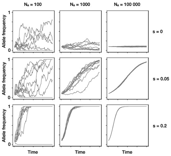The combined effects of drift and selection on genetic change over time (x-axis). Shown are simulated allele frequencies (y-axis) of a focal allele for different combinations of effective population size Ne (columns) and selection coefficient s (rows). A positive selection coefficient (s > 0) indicates a selective advantage of the focal allele compared to the other allele, if s = 0 both alleles are neutral and thus, allele frequency changes are only due to genetic drift. Each panel shows the results of ten independent replicates with an initial frequency of 0.1 for the focal allele. Note that when effective population size is small, even positively selected alleles sometimes go extinct due to drift (left column, middle and bottom row). Absolute frequencies k of the allele in generation t + 1 were obtained by randomly drawing from a binomial distribution with and , where w denotes the average fitness of the population and pt+1 denotes the expected frequency of the focal allele without drift in the next generation t + 1.