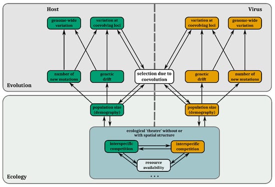 Because viruses depend on their hosts for replication, their genome evolution is also strongly influenced by their host [61,62]. Similarly, hosts are under constant pressure to reduce the detrimental fitness effects of viruses [63,64]. This reciprocal evolutionary interplay is called coevolution when adaptation of one species changes selection on the interacting partner and vice versa [65,66,67]. The dynamics and genetic consequences of host–virus coevolution in particular and of antagonistic species interactions in general have been enigmatic research topics dedicated to understanding the maintenance of genetic diversity [68], the evolution of sex [69], patterns of local adaptation [70], and the speed of evolution [71].