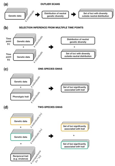 If phenotype data of sequenced individuals are available, it is possible to perform a genome-wide association study (GWAS; Figure 4c), which searches for alleles that are statistically associated with an observed phenotype (e.g., [121]). It should be noted that GWAS studies can yield different effect sizes for a single locus if the genetic structure of the coevolving partner is not taken into account [122]. The authors of this publication further demonstrated the value of integrating genomic information of both co-evolving partners simultaneously into a “two-species co-GWAS” [122].
