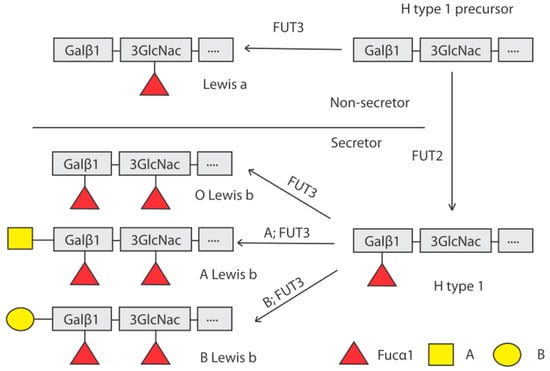 Biosynthesis pathway of histo-blood group antigens (HBGAs) by stepwise addition of monosaccharides to precursor structures. The FUT2 (secretor) gene encodes an α1,2-fucosyltransferase which adds a fucose residue in α1,2 linkage to the terminal galactose of the H type 1 precursor. Non-secretors, having a non-functional FUT2 enzyme, cannot synthesize the H type 1 antigen from its precursor and lack α1,2-linked fucose HBGAs in the intestinal mucosa and other secretions. The synthesis of the A and B antigens by the corresponding enzymes requires the presence of the H type 1 antigen, adding an N-acetylgalactosamine (A) or a galactose (B) in a α1,4 linkage on the galactose residue of the H type 1 antigen. The Lewis antigens are synthesized with the FUT3 enzyme which adds a α1,4-linked fucose residue on the N-acetylglucosamine of the H antigen or the H antigen precursor, generating Lewis a or Lewis b antigens respectively. Abbreviations: Gal: galactose; GlcNAc: N-acetylglucosamine; Fuc: fucose.