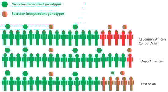 A simplistic overview of secretor status in different population groups. Secretors (green) are susceptible to secretor-dependent norovirus genotypes, including the globally predominant GII.4 genotype. Secretors are also further susceptible to secretor-independent genotypes. Non-secretors (red) are only susceptible to secretor-independent genotypes. As of yet, no genotypes have been observed to exclusively infect non-secretors. Weak-secretors (mix red or green) are common in East Asian populations, having a reduced expression of secretor antigens, and would thus be partially susceptible to secretor-specific genotypes. The prevalence of secretors is particularly high in Meso-American populations, which may lead to a higher disease burden in the population due to (1) higher rates of GII.4 infection and (2) a larger portion of the population being susceptible to both secretor and secretor-independent genotypes.