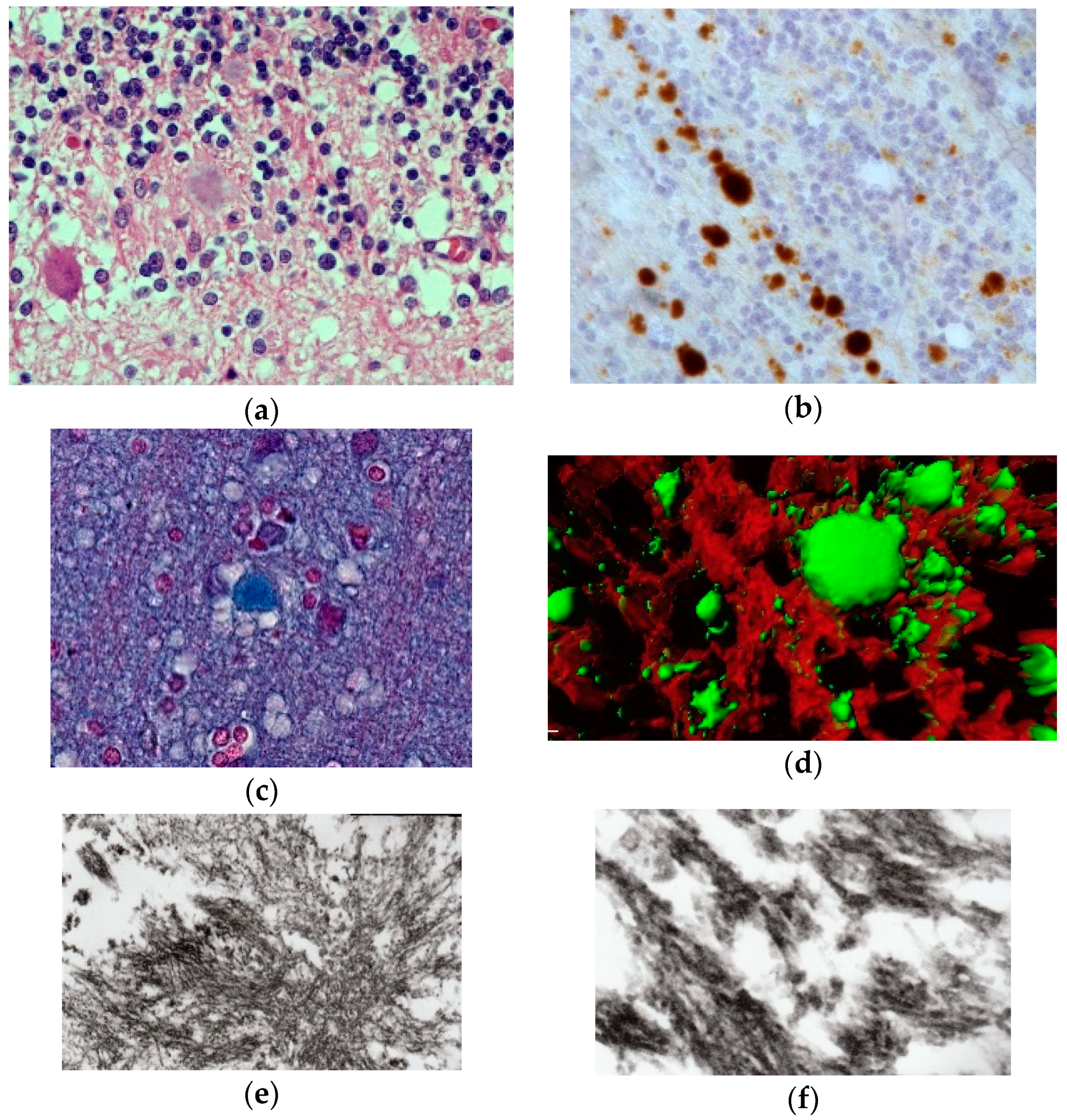 - Sikorska, B.; Liberski, P.P.; Sobów, T.; Budka, H.; Ironside, J.W. Ultrastructural study of florid plaques in variant Creutzfeldt-Jakob disease: A comparison with amyloid plaques in kuru, sporadic Creutzfeldt-Jakob disease and Gerstmann-Sträussler-Scheinker disease. Neuropathol. Appl. Neurobiol. 2009, 35, 46–59. [Google Scholar] [CrossRef] [PubMed]