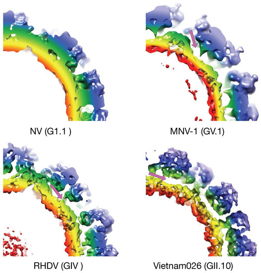 20]. While the P domains of NV VLPs rest upon the shell domain, there was a large gap in the electron density between the shell and protruding domains of MNV-1 (see mauve arrows in