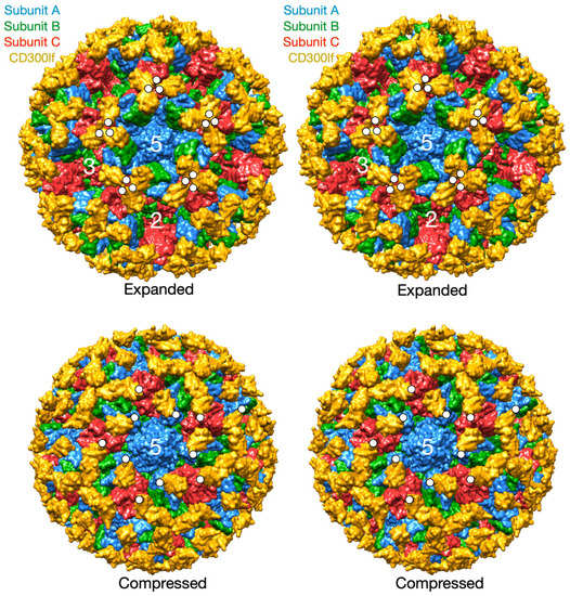 Figure 4. The C-termini of the CD300lf N-terminal fragment is noted as white circles on some of the copies of the receptor on the viral surface. As shown in the model of the expanded form, the C-termini of the CD300lf form trimers in the icosahedron. There is clearly not enough room for all of the P domains to be saturated with receptor. This In contrast, using the position of the P domain in NV as a guide, there is a great deal of space around each of the P domains for at least a higher degree of saturation with receptor. Interestingly, the P domains around the A subunits around the 5-fold axes are oriented such that there is clearly room for saturation. While there are currently no published reports that the Caliciviruses exist in both compressed and expanded conformations, the conservation of the flexible linker, the multiple reports of antibodies recognizing buried epitopes, and unpublished results (Sherman and Smith) all point to the existance of such a transition in all Caliciviruses. Finally, this figure shows just two conformations but it is more than likely that the flexibility of the linker allows for a wide array of conformations between these two extremes. This is likely why the P domains have extremely weak density in all of the genotypes shown in