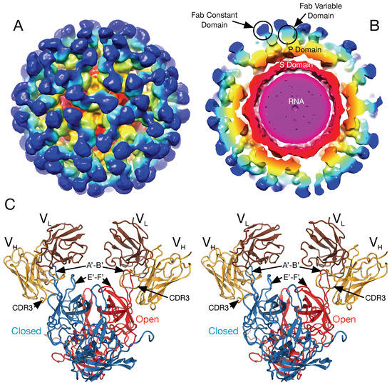 Figure 1 with the three copies of VP1 in the icosahedral asymmetric unit being designated as subunits A (blue), B (green), and C (red). Also noted in this figure is the location of the A’–B’ and E’–F’ loops in the P2 domain that will be discussed in detail below.