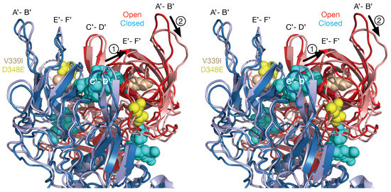 19], the outer two loops (A’–B’ and E’–F’) displayed two discreet conformations; a closed structure where the two loops are tightly associated and an open structure where the loops are splayed apart. This conformational difference is shown in