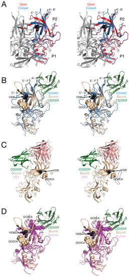 Interestingly, the conformation of the A’–B’ and E’–F’ loops in the receptor complex is nearly identical to that of the closed conformation. The major difference is in the C’–D’ loop that is “turned up” compared to the P domain alone. This affords enough space for the bile salt, GCDCA (tan spheres), to bind. It may be that the structural equilibrium in solution is shifted by GCDCA binding to the closed form, which may be preferred by CD300lf. In this way, the bile salts may enhance receptor binding, indirectly, by altering the dynamics and structural equilibrium of the P domain. What is particularly interesting is that one of the two escape mutants to the neutralizing antibody, 2D3, is the buried residue V339 (black spheres) that lies immediately adjacent to the bile salt binding site. As with the bile salts, we had proposed that the V339I mutation shifted the equilibrium towards the closed conformation that does not favor antibody binding [