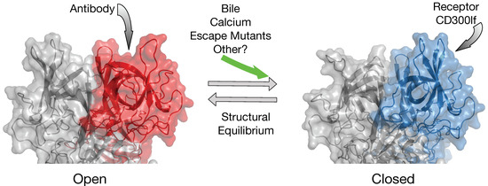 48]. Similar to the V339I escape mutant, compounds in the gut milieu such as calcium and bile salts may also push the structural equilibrium towards the closed conformation and it is apparently this conformation to which the receptor binds [