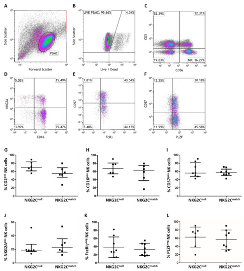 We compared phenotypic NK cell features between groups by flow cytometry with gating, as shown (Figure 1A–F). LIVE/DEAD stain was used to exclude dead cells after gating on the lymphocyte population (Figure 1B) and CD3negCD56pos lymphocytes in the lower right quadrant (Figure 1C) were selected for further phenotypic analysis. We then compared expression levels of CD2, CD16, and CD57, which are general markers for NK cell maturation (Figure 1G–I), and the expression of NKG2A, FcεRIγ, and PLZF, the loss of which relate to HCMV-driven NK cell maturation (Figure 1J–L). No significant differences were observed in comparing mean or median levels of any of these markers between the NKG2Cnull and matched control groups. This indicates that NK cells from NKG2Cnull HIV-infected individuals undergo similar phenotypic maturation to those from HIV-infected individuals expressing KLRC2.