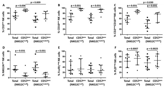 The maturation pattern of NK cells from the NKG2Cnull and NKG2Cmatch groups. The same gating strategy as described in Figure 1 was used to compare (A) CD2, (B) CD16, (C) CD2/CD16, (D) NKG2A, (E) FcεRIγ, and (F) PLZF expression on the entire NK cell population and CD57pos mature NK cells both within and between groups. The percentage of a particular marker positive or negative within the CD57pos population was calculated as (% markerpos/neg within the CD57pos NK fraction/% total CD57pos NK cells) × 100. Data were displayed as median values with IQR and the probability of differences between groups was calculated by the Mann-Whitney U test when data were not normally distributed with paired comparisons within groups performed by the Wilcoxon signed rank test (A–E). Data were displayed as mean values with SD and differences between groups compared by the Student’s t test when data were normally distributed with paired comparisons within groups carried out using the Student’s paired t test (F). Statistically significant differences are shown on graphs above lines spanning comparison groups.