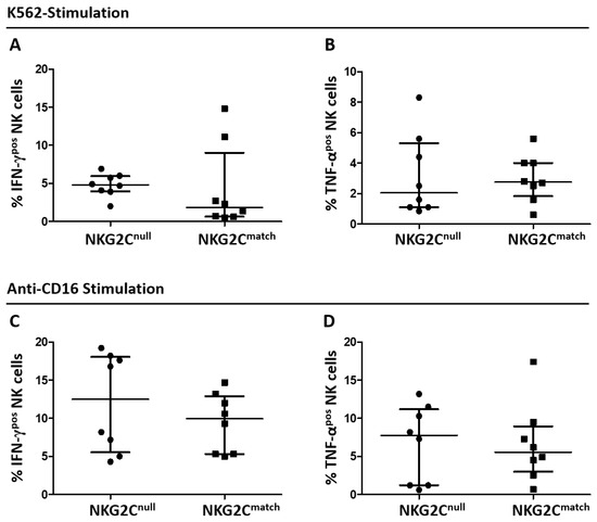 To investigate whether the general phenotypic equivalence of the groups’ NK cells extended across their function, we first measured the fractions of NK cells expressing IFN-γ or TNF-α following stimulation with K562 cells. Similar fractions of NK cells from both groups responded to stimulation with K562, measured by IFN-γ and TNF-α expression (Figure 3A and Figure 3B, respectively). These data indicate that NK cells from NKG2Cnull and NKG2Cmatch groups were functionally equal in terms of general activation with response to stimulation through NCR by K562 cells. Since adapted NK cells are reportedly superior in terms of antibody-dependent cytokine production, we next measured NK cell activation through CD16 receptors [14,15]. Responses triggered by anti-CD16 (Figure 3C,D) were notably stronger than those stimulated by K562 cells (Figure 3A,B). Again, we saw no significant differences between groups in either IFN-γ or TNF-α production in response to stimulation through CD16 (Figure 3C and Figure 3D, respectively). Our results also indicate equivalence between groups in terms of pro-inflammatory cytokine responses to CD16 stimulation, as measured by IFN-γ and TNF-α expression. These results are generally consistent with functional equivalency of NK cells from NKG2Cnull and matched controls co-infected with HCMV and HIV in terms of pro-inflammatory cytokine production following stimulation though either NCR or through CD16.