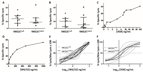 We next compared NK cell cytotoxicity against antibody-treated cell lines in anti-CD16 redirected cytotoxicity and classical ADCC assays. At optimal Ab concentrations, there was no significant difference between the NKG2Cnull and NKG2Cmatch groups in the level of either anti-CD16 redirected lysis of P815 cells (Figure 4A) or antibody-dependent lysis of C1R-B27 cells (Figure 4B). These data indicate equivalence between groups in their capacity for ADCC and anti-CD16 redirected lysis regardless of NKG2C expression. However, measuring cytotoxicity at only one Ab concentration does not address possible differences in sensitivity to triggering through CD16. To test whether the sensitivity of triggering through CD16 differed between groups, we repeated cytotoxicity assays with serial dilutions of 3G8, which ranged over 12 doubling dilutions from 100 ng/mL to 0.05 ng/mL, and anti-HLA-I Ab W6/32, which ranged from 1000 ng/mL to 16 ng/mL over six doubling dilutions. Figure 4C,D represent Ab titrations. The 50% effective Ab concentration (EC50), which is defined as the concentration required to elicit a half maximal cytotoxicity response, was estimated for NK cells by each subject and compared between groups. Both the NKG2Cnull and NKG2Cmatch groups had a similar mean EC50 of ~125 ng/mL for W6/32 Ab titration in ADCC assays and were similar with respect to the 3G8 titration for redirected P815 cell lysis at ~1.2 ng/mL. The highly similar EC50 values for both groups suggest comparable sensitivity to triggering through CD16 between NK cells from NKG2Cnull and NKG2Cmatch, HIV-infected individuals co-infected with HCMV. In order to visually convey the functional similarity across the groups, despite the high variability in the absolute levels of killing, we normalized our results to 100% to show largely overlapping titration curves from both the NKG2Cnull and NKG2Cmatch groups (Figure 4E,F).