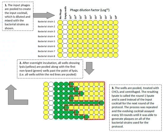 In order to generate novel phages from our laboratory strains, we developed a protocol based on that used by the George Eliava Institute of Bacteriophage, Microbiology and Virology (IBMV), Tbilisi, Georgia (see Appendix A). The protocol is represented schematically in Figure 1. Phages Pa2, RWG, and ΦKZ were combined 1:1:1 by titer to yield an input cocktail of 1 × 1010 pfu/mL. Using a 96-well microtiter plate, 100 µL of serial 10-fold dilutions (100 to 10−9) of the cocktail were added to 100 µL of double-strength LB containing 1 µL of an overnight bacterial culture of a single strain. Eight bacterial strains can be tested on each plate. One well was used for each dilution plus a control well with no phage. After overnight incubation at 37 °C on a shaking platform at 200 rpm, the plates were visually inspected. Wells showing complete lysis, plus the first turbid well, were pooled. If no lysis was seen, the well containing the undiluted phage cocktail was harvested. Pooled lysates were cleared by vortex mixing with 1:100 CHCl3, followed by centrifugation (15,000× g for 15 min). The lysate was termed the round 1 cocktail and was used to initiate the next round of the protocol using the same set of bacterial strains.