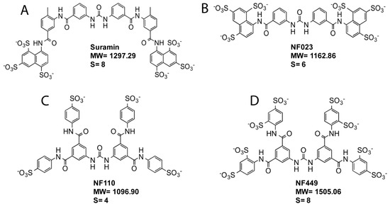 Structure of suramin and suramin analogs. (A) Suramin. (B) NF023. (C) NF110. (D) NF449. S = number of sulfate groups. MW = molecule weight.