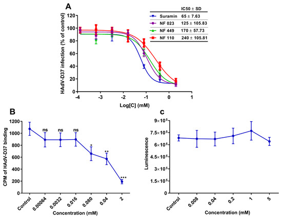 Dose-dependent inhibition of HAdV-D37 infection of, and binding to, human corneal epithelial (HCE) cells by GAG-mimetics. (A) HAdV-D37, pre-incubated with increasing concentrations of suramin and suramin analogs, infection of HCE cells. Virus infection of cells is presented as % infection of untreated viruses. (B) 35S-labeled HAdV-D37, pre-incubated with increasing concentrations of suramin, binding to HCE cells. Virus binding to cells is presented as count per minute (CPM). (C) Analysis of the cytotoxic effect of suramin on HCE cells. Cell viability was determined by using ATP-based assay and the result is presented as luminescence. Error bars represent mean ± SEM. ns = not significant. * P < 0.05, ** P < 0.01 and *** P < 0.001 relative to control.