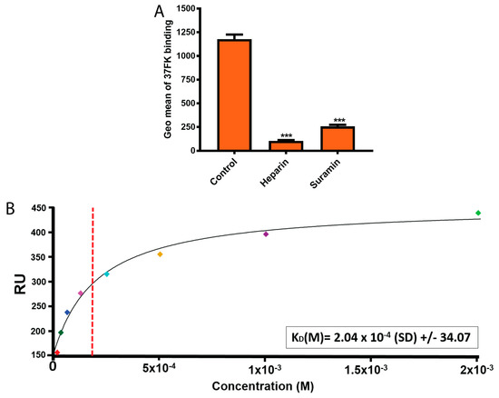 Suramin directly interacts with 37FK. (A) Binding of His-tagged 37FK, pre-incubated with heparin and suramin, to HCE cells. FK binding to cells was analyzed on the flow cytometer and the data is presented as the geometric mean of fluorescence (Geo mean). (B) SPR analysis of GST-tagged 37FK interaction to suramin. The red dashed vertical line represents the estimate of KD at half-maximal binding of the 37FK and suramin. The small squares in different colors represent the concentration points. Error bars represent mean ± SEM. *** P < 0.001 relative to control.