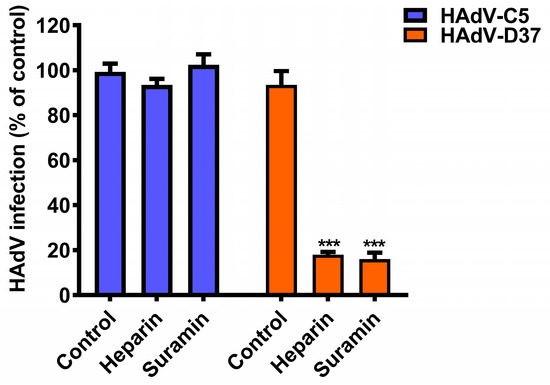There are more than 80 HAdV types identified to date and these are classified into seven species (A to G) [41]. Several studies have shown that some antiviral compounds display anti-adenoviral activities against most/many HAdV types, whereas other compounds exert HAdV species-specific activity [10,11]. Thus, we wanted to investigate if the antiviral activity of suramin is HAdV species-specific. To test this, we pre-incubated HAdV-C5 (belonging to species C HAdV, and used here as a reference virus) with suramin, and analyzed virus infection of HCE cells. Interestingly, suramin inhibited (by ~85%) HAdV-D37 but not HAdV-C5 infection of HCE cells (Figure 4), indicating a HAdV species-specific antiviral activity of suramin. Heparin (used as a control glycan) neither inhibited HAdV-C5 nor HAdV-D37 infection of cells, as reported recently [26].