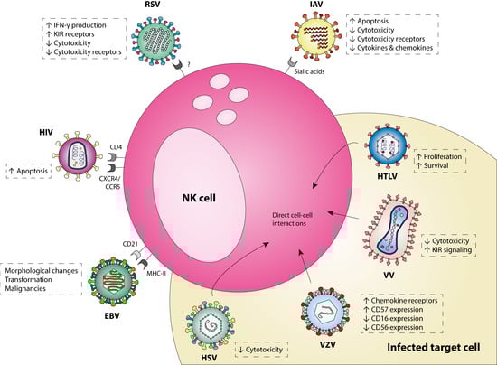 A schematic representation of the most-studied viruses that infect NK cells. EBV, Epstein Barr virus; HIV, human immunodeficiency virus; HSV, herpes simplex virus; HTLV, human T-lymphotropic virus; IAV, influenza A virus; RSV, respiratory syncytial virus; VV, vaccinia virus; VZV, varicella zoster virus.