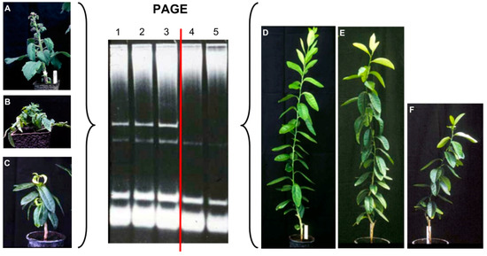Analysis of different inoculated hosts by polyacrilamide gel electrophoresis (PAGE) and ethidium bromide staining. A characteristic band corresponding to a viroid RNA was stained in samples (1–3) from Gynura aurantiaca (A), tomato (B), and Etrog citron showing severe symptoms, whereas the same band was not observed in samples (4,5) from Etrog citron plants displaying mild and moderate symptoms (D–F).