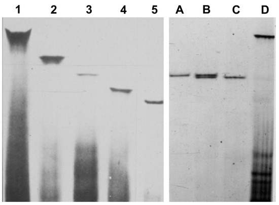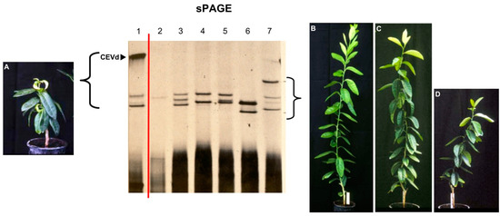 Analysis of inoculated Etrog citron plants by sPAGE and silver staining showing that they were infected with single viroids (1–5). CVd-II was not homogeneous but conformed by several bands (A,C) with slightly distinct electrophoretic mobilities (B) that were further characterized as specific variants of Hop stunt viroid (HSVd) showing faster mobility than CEVd (D).
