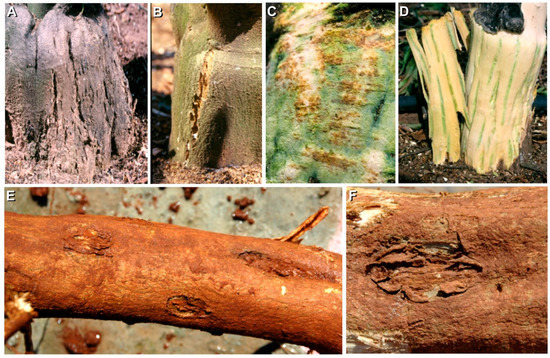Characteristic symptoms as a result of viroid infection in plants grafted on trifoliate orange: Bark scaling induced by CEVd in trifoliate orange (A); bark cracking induced by Citrus bark cracking viroid (CBCVd) in trifoliate orange (B); wood pitting and gum deposits in the clementine scion caused by cachexia strains of HSVd (C); green streaks under the cracks induced by CBCVd in trifoliate orange (D). Lesions in the roots caused by CEVd in Citrange carrizo roots (E,F).