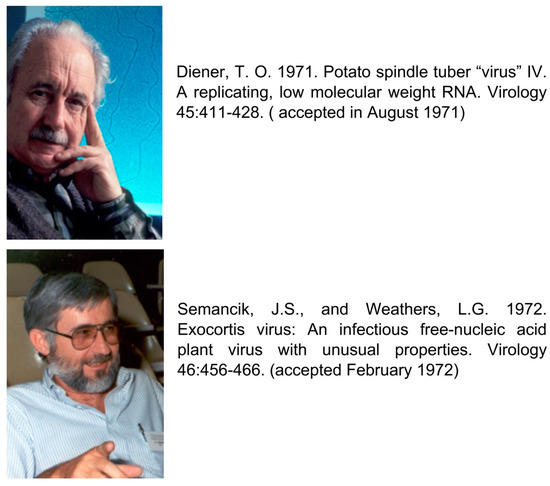 As in the case of other disciplines, viroid research requires the input of competent scientists. However, within the research world, there is a mixture of two quite different personality traits—competence and competition. The acknowledgment and recognition of the discovery of viroids put together two outstanding personalities, T.O.Diener and J.S.Semancik, who were attempting to identify the causal agent of two diseases, “potato spindle tuber” and “citrus exocortis”. These two competent scientists were extremely competitive, and they did not communicate with each other, a situation that has created misunderstandings and questionable actions. Today, in many publications, T.O.Diener is considered the first one to have discovered/described VIROIDS as a new class of pathogenic agents affecting potatoes in a publication dated in 1971 [53], whereas similar work of J.S.Semancik working on citrus published in 1972 [7], in many instances remains unknown. As illustrated (Figure 5), these findings were the result of independent approaches and the two articles were accepted for publication within a six-month period. Therefore, these two scientists should share the same recognition.