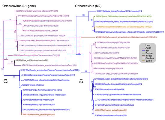 Phylogenetic relationships of the L1 and M2 gene sequences of orthoreovirus, inferred by using the maximum-likelihood method with the generalised time-reversible (GTR) + GAMMA distribution model in RAxML. Colored branches represent viruses isolated from different hosts. Red branches denote new sequences collected from Eonycteris spelaea bats in Singapore. Bootstrap support values greater than 50% are displayed at major nodes. The scale bar indicates the number of nucleotide substitutions per site.