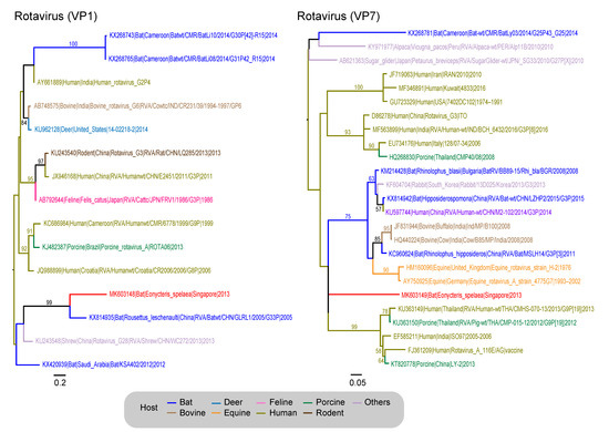 Phylogenetic relationships of the VP1 and VP7 gene sequences of rotavirus, inferred by using the maximum-likelihood method with the GTR + GAMMA model in RAxML. Colored branches represent viruses isolated from different hosts. Red branches denote new sequences collected from Eonycteris spelaea bats in Singapore. Bootstrap support values greater than 50% are displayed at major nodes. The scale bar indicates the number of nucleotide substitutions per site.