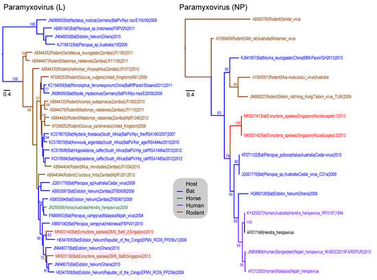 Phylogenetic relationships of the L and NP gene sequences of paramyxovirus, inferred by using the maximum-likelihood method with the GTR + GAMMA model in RAxML. Colored branches represent viruses isolated from different hosts. Red branches denote new sequences collected from Eonycteris spelaea bats in Singapore. Bootstrap support values greater than 50% are displayed at major nodes. The scale bar indicates the number of nucleotide substitutions per site.