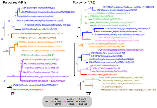 Phylogenetic relationships of the VP1 and VP2 gene sequences of parvovirus, inferred by using the maximum-likelihood method with the GTR + GAMMA model in RAxML. Colored branches represent viruses isolated from different hosts. Red branches denote new sequences collected from Eonycteris spelaea bats in Singapore. Bootstrap support values greater than 50% are displayed at major nodes. The scale bar indicates the number of nucleotide substitutions per site.