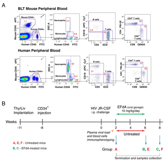 We reported that daily oral administration of the highly potent nucleoside analog EFdA at 10 mg/kg/day completely suppressed HIV viremia in NSG-BLT mice within 2 weeks of treatment [32]. These data prompted us to create an in vivo model of HIV persistence in which HIV replication in the lymphoid tissues of humanized mice is suppressed to extremely low levels, which recapitulated ART-suppression in HIV-infected individuals. The experimental approach of this model design is represented in Figure 2. One cohort of 30 NSG-BLT mice was generated using 8-week-old NSG mice followed by injection of autologous CD34+ cells 3 weeks later. The engraftment of mouse peripheral blood with human leukocytes was evaluated by flow cytometry 10 weeks after CD34+ cell injection (2 weeks after HIVJR-CSF inoculation) (Figure 2A). Human CD45+ cells were found in mouse peripheral blood typically ranging from 15% to 30% of total mouse and human leukocytes with the proportions of CD4+ and CD8+ cells similar to those in human blood.