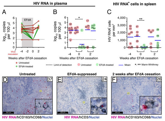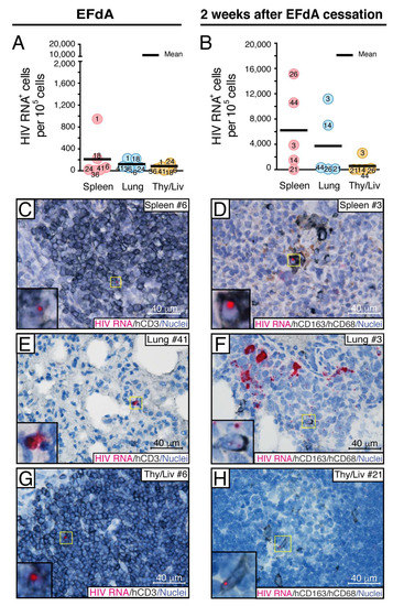 NSG-BLT mice were inoculated with HIVJR-CSF 8 weeks after CD34+ cell injection, and, 2 weeks later, plasma and organs from 7 mice (group A) were collected to verify the establishment of HIV infection. HIV RNA levels in the plasma reached a mean of 3.4 log10 copies per 100 µL (Figure 3A,B, 2 weeks after inoculation), and 4 out of 7 spleens contained numerous HIV RNA+ cells with a mean of 1400 HIV RNA+ cells per mm2 (Figure 3C, 2 weeks after inoculation). Having validated well-established HIV infection in the mice 2 weeks after virus inoculation, the remainder of the HIV-inoculated mice were treated for 4 weeks with EFdA (10 mg/kg/day by once-daily oral gavage, groups B and C) or were untreated (groups E and F) beginning 2 weeks after HIVJR-CSF inoculation (Figure 2B). Plasma and organs were collected 6 and 8 weeks after virus inoculation from HIV-inoculated EFdA-treated mice (groups B and C) and HIV-inoculated untreated mice (groups E and F).