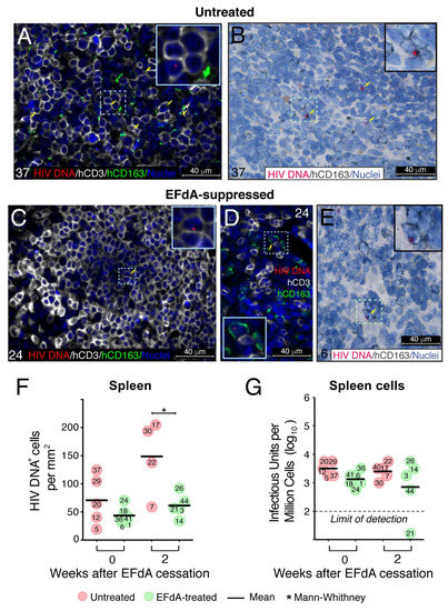 The significant decline in the number of HIV RNA+ cells we observed in the spleen of EFdA-suppressed mice prompted us to examine the population of cells harboring HIV DNA. HIV DNA was detected by fluorescent (Figure 5A,C,D) and chromogenic (Figure 5B,E) DNAscope ISH using a target probe specific to the noncoding strand of integrated HIV DNA. HIV DNA was clearly distinguished as a discrete dot in the nucleus of numerous hCD3+ T lymphocytes (Figure 5A, yellow arrow) and random hCD163+ macrophages (Figure 5B, inset) in the spleen of HIV-inoculated untreated mice. Human T cells (Figure 5C, inset) and macrophages (Figure 5D,E, insets) containing an HIV DNA signal in the nucleus were also evident in the spleen of EFdA-suppressed mice. During treatment, there was no difference in the number of HIV DNA+ cells in spleens from untreated and EFdA-suppressed mice (Figure 5F). The same level of HIV DNA+ cells was maintained during the 2 weeks after drug cessation. These results reflect the feature of EFdA to inhibit HIV reverse transcriptase-catalyzed pro-viral DNA synthesis [50] and prevent new infection. Therefore, it suggests that the integration of the HIV genome into those HIV DNA+ cells occurred before EFdA treatment. Notably, the number of HIV DNA+ cells in the spleen of untreated mice continued to increase to almost 150 HIV DNA+ cells/mm2 8 weeks after virus inoculation and was significantly higher than in the spleen of EFdA-suppressed mice after viral rebound (61 HIV DNA+ cells/mm2). Next, we verified that cells harboring HIV DNA during EFdA suppression contain a replication competent virus. Immediately after euthanasia, each mouse spleen was cut in half with one half fixed for RNAscope assays and the other half was used for isolation of spleen cells. When dispersed spleen cells were co-cultivated with PHA-stimulated normal donor PBMC for 7 days, similar levels of infectious HIV (3.0–3.5 log10 IUPM) were detected in the untreated and EFdA-suppressed groups (Figure 5G) even though we assume that greater IUPM should be present in the spleens of untreated mice because the upper limit of IUPM detection was 3.75 log10.