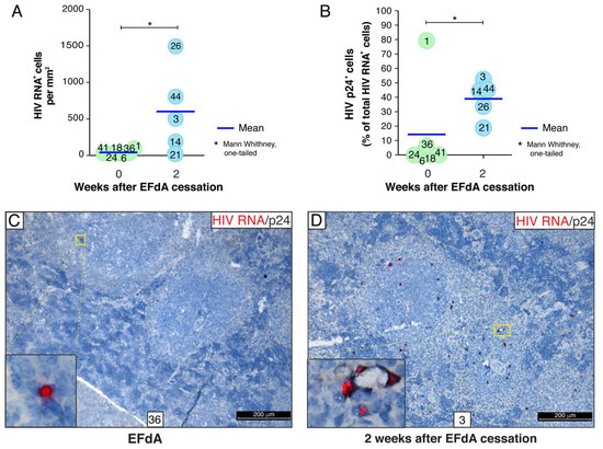 3.4. A Rare Subset of HIV-Infected Cells Expressed HIV RNA and p24 Capsid Protein during Fully Suppressive EFdA Treatment