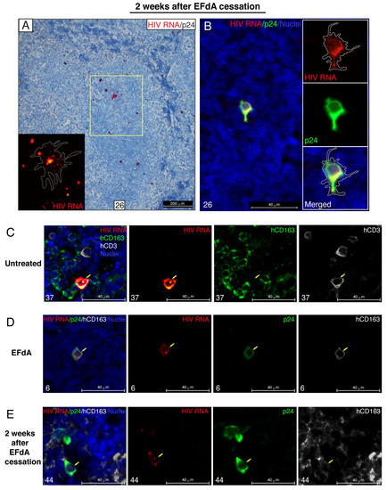In spleens from the untreated NSG-BLT mice, the majority of cells expressing a high level of HIV RNA was identified as human CD3+ T cells (Figure 7C). These HIV RNAhigh cells were often surrounded by human CD163+ macrophages containing discrete HIV RNA+ red dots in the nucleus and cytoplasm. Almost all the HIV RNA+ cells in the spleens of EFdA-suppressed mice were also identified as CD3+ T cells (Figure 3E and Figure 4C). We performed an extensive co-localization analysis for HIV RNA, p24, and human CD163 or CD3 with 6 spleen cross-sections from each of 6 EFdA-suppressed mice in order to detect very rare hCD163+ macrophages expressing both HIV RNA and p24 (Figure 7D). However, the level of expression of both HIV RNA and p24 was less than was observed in macrophages 2 weeks after EFdA cessation (Figure 7E).