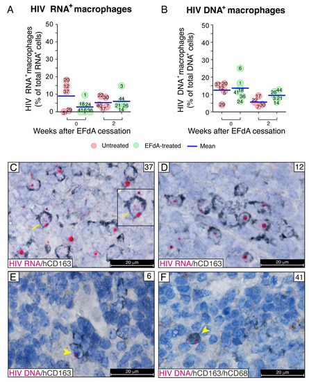 3.5. During Fully Suppressive EFdA Treatment, HIV RNA and Integrated Provirus Were Detected in CD163+ Macrophages