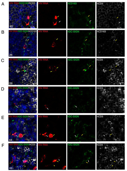 Two types of HIV+ macrophages were frequently observed in the spleens of untreated mice. First, hCD163+ macrophages contained both distinct fuchsia dots in the nucleus by visualizing the sense strand of integrated HIV DNA and solid red dots of HIV RNA in the cytoplasm, which indicates HIV replication (Figure 8C). The second type of HIV+ macrophage contained only a strong red signal of integrated HIV DNA in the nucleus with no HIV RNA detected in the cytoplasm (Figure 8D). This second type of macrophage was commonly detected in the spleens during EFdA suppression. The DNAscope further verified the signal of integrated provirus observed in the nucleus of macrophages by the RNAscope. We incorporated an RNase pretreatment step into the DNAscope assay to ablate HIV RNA detection and used an HIV-1 clade B sense probe that specifically targets integrated viral DNA noncoding strands [40]. The yellow arrows show human macrophages with a bright red dot of HIV DNA located in the blue nucleus stained with hematoxylin (Figure 8E,F). The ability to detect the sense strand of integrated HIV DNA using an HIV gag-pol antisense probe allowed us to detect potential HIV spread from a CD3+ T cell expressing a high level of HIV RNA to an adjacent hCD163+ macrophage with a single pink dot in the nucleus resulting from the spatial overlap of the red HIV DNA signal with the blue DAPI nucleus counterstain (Figure 9A). These data demonstrated that CD163+ macrophages in HIV-inoculated NSG-BLT mice may become infected by HIV and prompted us to examine further viral spread after EFdA cessation. The innate immune receptor DC-SIGN (dendritic cell-specific intercellular adhesion molecule-3 grabbing non-integrin) is a well-known enhancer of HIV infection that binds to the HIV envelope glycoprotein gp120 and promotes efficient infection in trans of cells that express CD4 and CCR5 [51]. The DC-SIGN-dependent mechanism of macrophage-HIV virion engagement is essential for both macrophage cis and trans infection [52]. We found that human CD163+ macrophages, which were frequently detected in proximity to HIV-infected T cells, express DC-SIGN protein (Figure 9B, yellow arrow). These data were observed in 5 spleens in a total of 3 multiplex fluorescent RNAscope/IHC assays. Next, we performed co-localization analysis for HIV RNA, human DC-SIGN, and human CD3 in 6 multiplex fluorescent RNAscope/IHC assays using 5 spleens from EFdA-suppressed mice 2 weeks after EFdA cessation. Detailed tissue analyses allowed us to monitor the following steps of HIV spread in vivo after EFdA cessation and viral rebound: (1) HIV RNA accumulation along the CD3+ cell membrane of T cells was often accompanied by DC-SIGN clustering on the cell surface of adjacent presumptive macrophages, which resembles DC-SIGN expression at the virological synapse [53,54,55] (Figure 9C, yellow arrows). (2) At the site of surface contact between an hCD3+ T cell (white) and a DC-SIGN+ presumptive macrophage, HIV virions occasionally appeared with a yellow color that results from the spatial overlap of a red HIV RNA punctum and green DC-SIGN protein, which resembles virion transport across the virological synapse [56,57] (Figure 9D). (3) DC-SIGN was highly expressed at the site of surface contact between an HIV-infected T cell abundantly expressing viral RNA and adjacent macrophages with evidence of initial HIV infection. This suggests an HIV spread (Figure 9E). (4) Abundant HIV RNA expression by infected DC-SIGN+CD3– presumptive macrophages. Figure 9F shows discrete HIV RNA puncta likely representing HIV virions that are redistributed from the HIV RNAhigh cell body (yellow arrow) to the DC-SIGN+ cell periphery (white arrow).