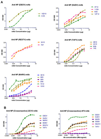 To assess the efficacy of our purified anti-NP mAbs, a wide range of antibody concentrations were first tested against inactivated whole virus preparations of various filoviruses by ELISA (Figure 1). Most of the mAbs demonstrated binding capacity with different affinities to various filovirus NPs (Figure 1 and summarized in Table 2). The EBOV-specific anti-NP mAbs (15D10 and 6E5), as well as the SUDV-specific mAbs (3F12, 11G9, 6G5, and 12F12) demonstrated medium to strong binding to the NP. Both RESTV-specific mAbs (2A10 and 7E7) and all the TAFV-specific mAbs (4B10, 2A10, 8G9, and 1H3) were able to bind moderately to the NP. Of the MARV-specific mAbs, only 6E9, 8H4, and 7A12 showed strong binding affinity to the NP, whereas 1G10 and 5E9 bound weakly. Notably, preliminary screening revealed two antibodies (2G10 and 4F9) that were cross-reactive against multiple filovirus NPs. In our ELISA assay, antibody 2G10 bound strongly with the EBOV NP and moderately with the NP of SUDV, TAFV, and BDBV; however, it did not bind with the MARV NP (Figure 1B). Similarly, 4F9 bound the NP from all the filoviruses, except MARV, with varying affinities (Figure 1B).