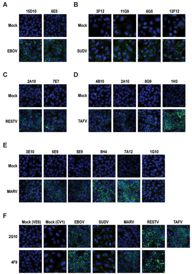 Vero E6 and CV-1 cells were grown in 96-well plates, infected with different filoviruses at a multiplicity of infection (MOI) of 3, and fixed with 10% formaldehyde 48 h post-infection (hpi). MOI 3 was used to confirm that the majority of the cells were infected. Fixed cells were washed with PBS, permeabilized with 0.1% Triton X-100 in PBS for 5 min, and blocked with 3% BSA/PBS for 30 min. The cells were then incubated with different anti-filovirus NP mAbs (1 mg/mL) diluted to 1:300 in 1% BSA/PBS for 1.5 h at room temperature, followed by incubation with the secondary antibody Alexa Fluor 488-conjugated goat anti-mouse (Thermo fisher, Waltham, OH, USA) for 1 h. Nuclei were stained with DAPI (Thermo fisher). Images were acquired using a Zeiss LSM 700 confocal microscope (Jena, Germany).